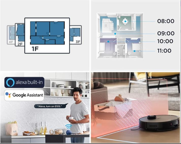A 4000 Pa teljesítményű motor és akár 180 perces akkumulátor-üzemidő lehetővé teszi, hogy az E10s könnyedén megbirkózzon a porral, szennyeződésekkel és állatszőrrel. Ha az akkumulátor lemerül, automatikusan visszatér a dokkolóhoz, feltölt, majd onnan folytatja, ahol abbahagyta.